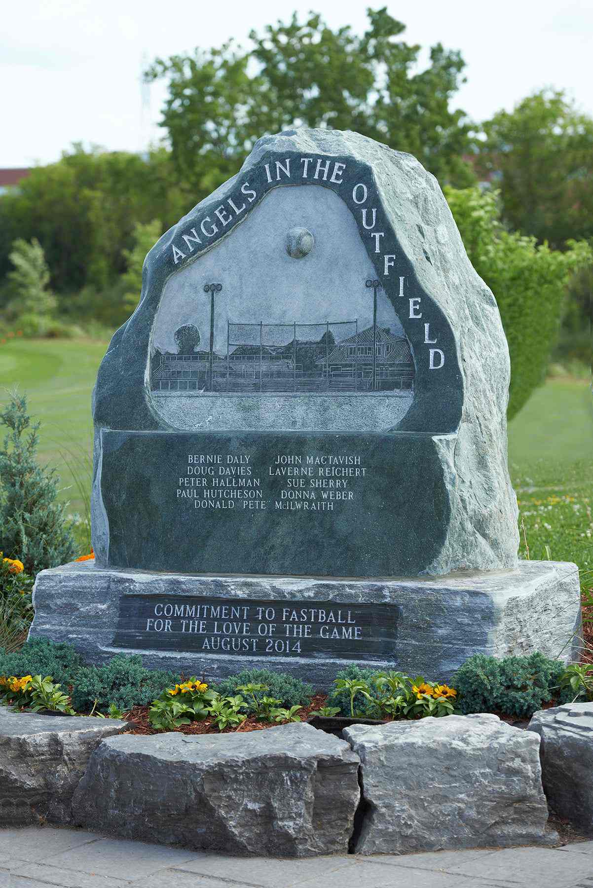 We lost Ray Alviano pictured above with our Memorial Stone project. He was a avid fastball man who served as GM of Ladies fastball, First President of Kitchener Fastball Promotions who brought the four ISC World Tournaments here. Ray was on our Memorial stone Committee as our talented carver Rob, took a field stone and turned it into a work of art. Ray spent many days in ball yards and as a Sports writer knew his trade very well after serving for 39 years.
