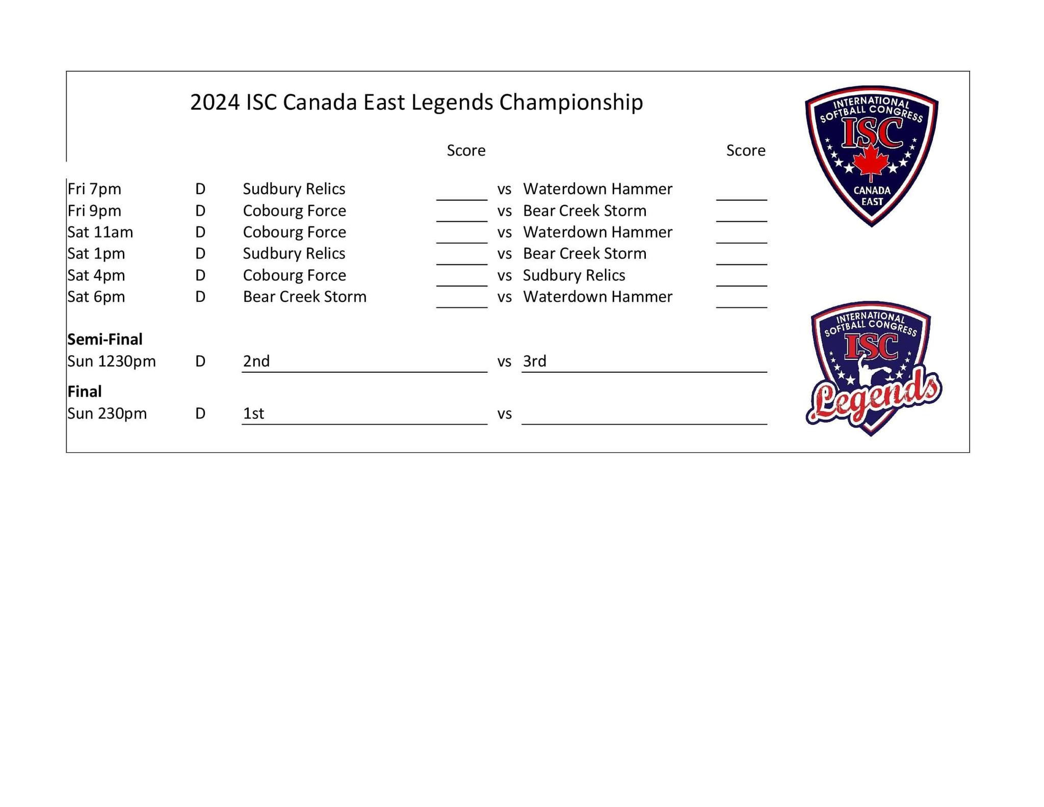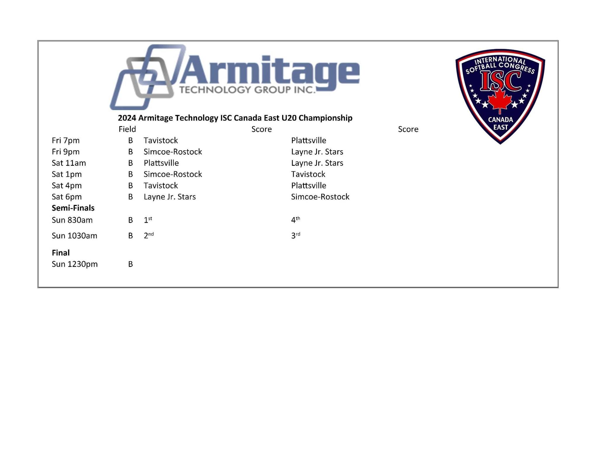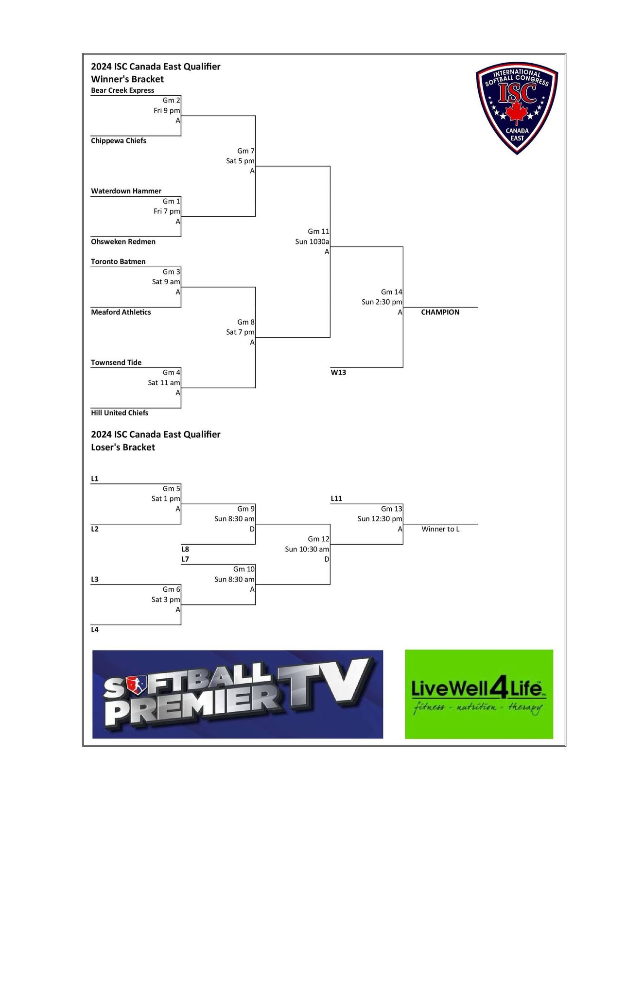 We are pleased to present the schedules for the 2024 ISC Canada East Qualifier at Keterson Park in Mitchell, ON June 14-16. We have three divisions: ISC, U20 and Legends. Games start Friday at 7pm, go all day Saturday and wrap up mid-afternoon on Sunday. Streaming will be available here on ISC Canada East and on Softball Premier. Thanks to our sponsors Live Well4Life, Microchips4Pets and Armitage Technology Group.