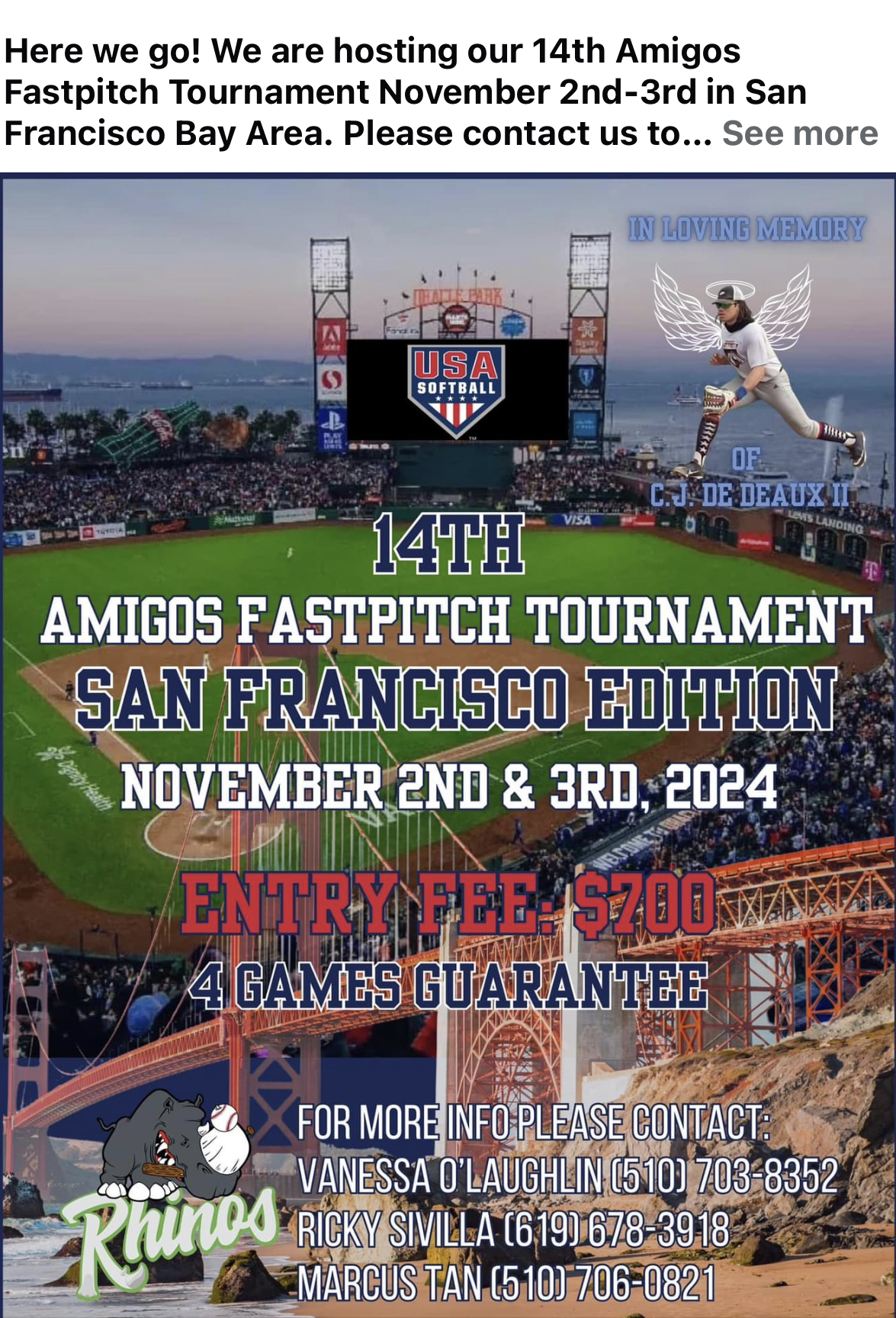Marcus Tan is the co-organizer for the Amigo’s Tournament which will be held Saturday and Sunday, November 2-3, 2025 in Hayward. They are looking for more teams to enter. They are looking for teams/sponsors/pitchers that would be interested in putting a team in the tournament. Please let Marcus know asap. He can be reached at (510)706-0821.