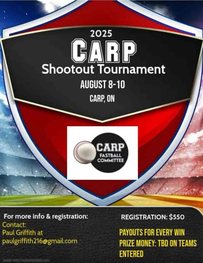 The 3rd Annual Carp Shootout men's fastball tournament will be held August 8-10, 2025 at the Carp Fairgrounds, near Ottawa, ON.