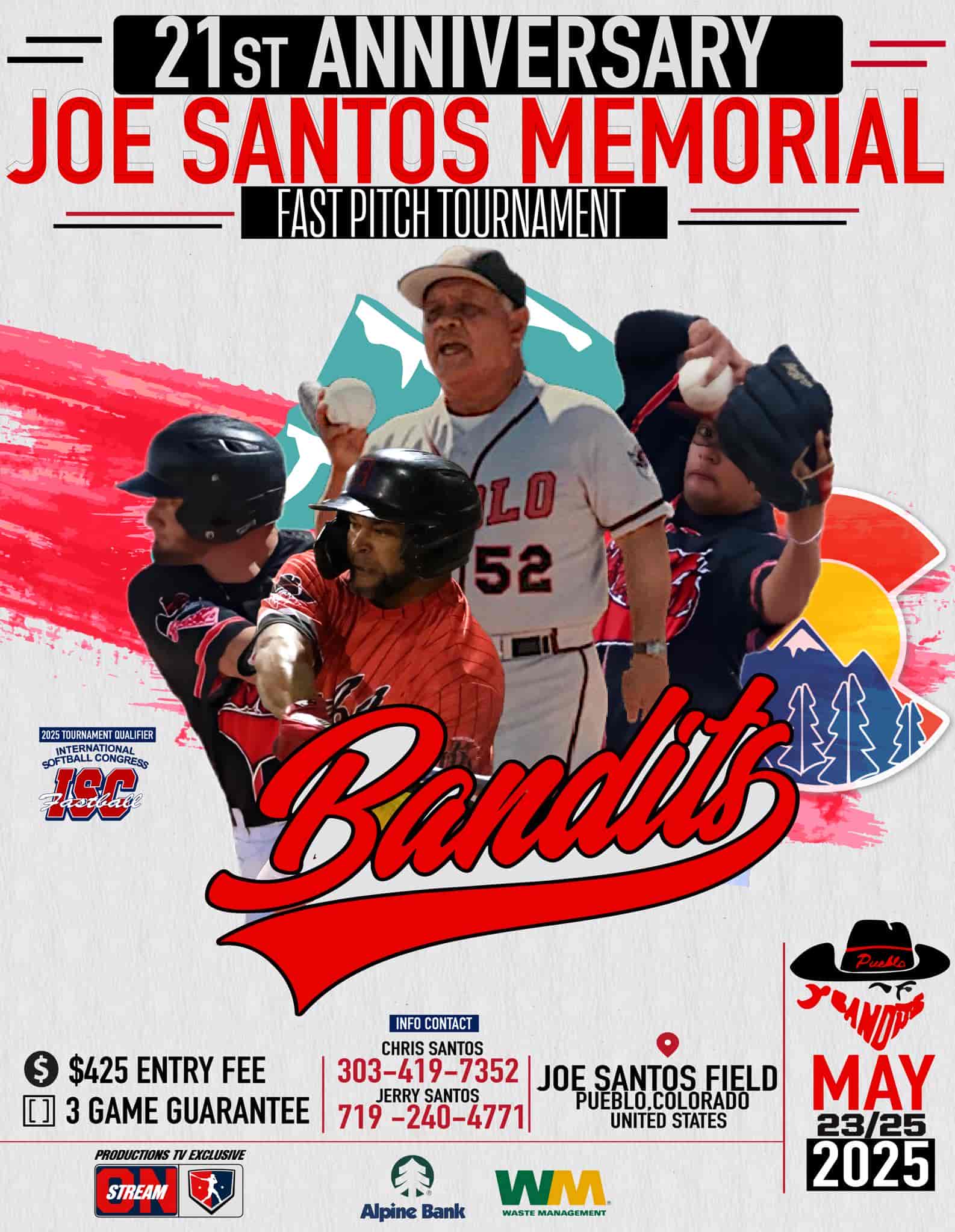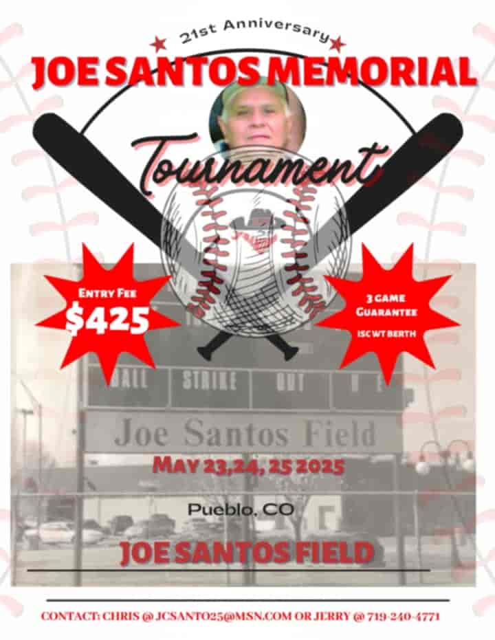 Entries are still being accepted for the 21st Anniversary Joe Santos Memorial Tournament! The tournament is limited to 10 teams and all games will be streamed live by Softball Premier and played at Joe Santos Field in Pueblo, Colorado. Tournament action starts on Friday with opening Ceremony followed by 3 games so teams should be prepared to play on Friday night! The tournament champion will win a berth to the 2025 ISC World Tournament to be held July 26th to August 2nd in Mankato, Minnesota. Contact information is on both promotional flyers!
