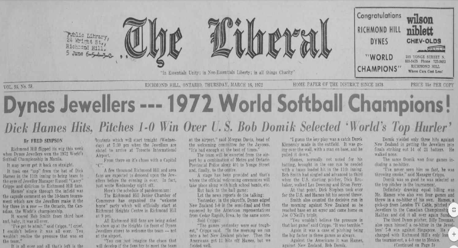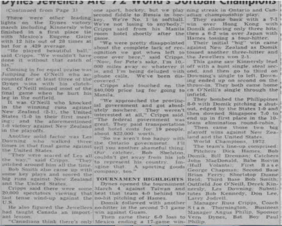 Article AÂ Â - Dynes Jewellers - 1972 World Softball Champions