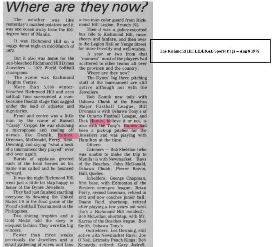 A fan asked me this weekend about who was on the famous 1972 World Champion Richmond Hill Dynes team and alas, I could not find it. But I turned to Dave Birnie and he sent me this great picture with the captions.